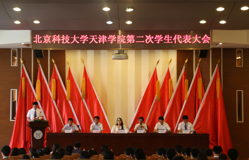 6月16日,北京科技大學天津學院第二次學生代表大會在學院理工圖書館學術報告廳召開。出席本次大會開幕式的領導有:天津市學生聯合會執行主席劉冰清,北京科技大學天津學院院長郭景文,黨委書記王斌,黨委副書記葉振楠,團委書記羅富臣,院學生會主席張凱睿。