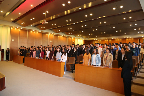 大會伊始,全體師生起立,奏唱國歌。