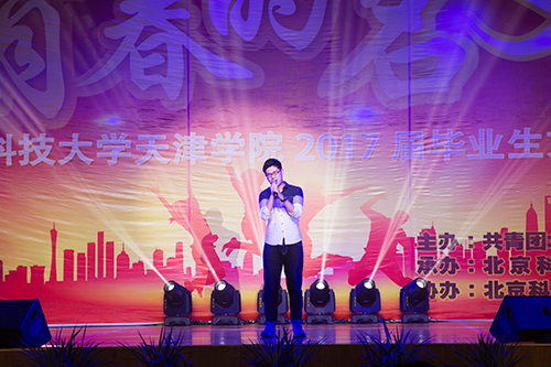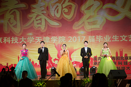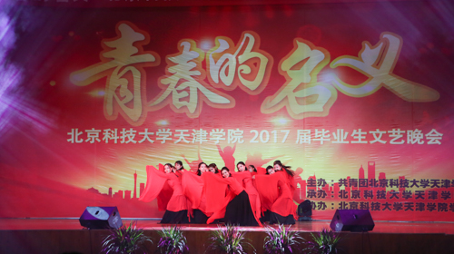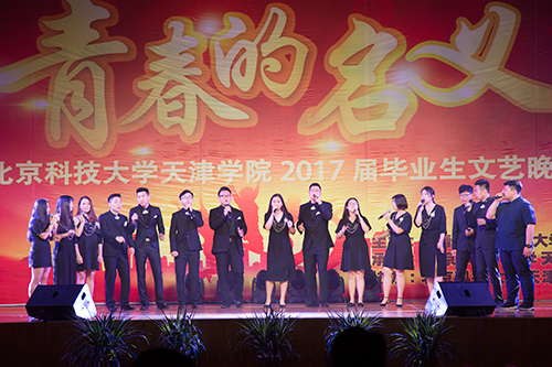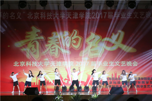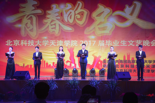 5月24日19:00,“青春的名義”北京科技大學天津學院2017屆畢業生文藝晚會在學院體育館隆重舉行。北京科技大學天津學院黨委書記、院長王斌,黨委副書記白亮、葉振楠,教務處處長張建華,土木系主任劉勝富,材料系主任沈衛平,法律系主任朱京安,黨建辦主任郭雅娟,國際交流處處長柯瑜,經濟系黨總支書記范麗麗,材料系黨總支書記羅富臣,學生處副處長、土木系黨總支書記孟祥瑜,管理系黨總支書記王軍,法律系黨總支書記馮海燕,外語系黨總支書記張莉,藝術系副主任林碧蕓和團委書記殷實等嘉賓出席晚會并和2017屆畢業生一起觀看演出。