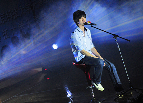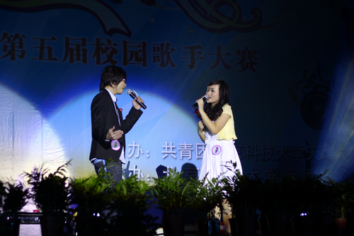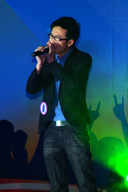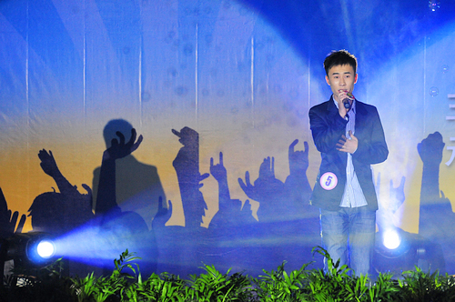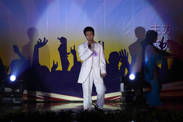 決賽當晚現場氣氛十分熱烈,吸引了眾多觀眾到場。參賽選手親友團熱情洋溢,或手持海報或揮動熒光棒或大聲吶喊,為他們支持的選手加油助威。每組選手出場前,會播放VCR介紹參賽選手,引出接下來的選手展示。由金融0902班的郭夢佳帶來的一曲曲風優美的《崇拜》拉開了當晚決賽的序幕。隨后來自土木0704班的焦禹禹帶來自彈自唱的原創歌曲《我的名字叫焦禹禹》,更讓所有觀眾對他的創作才華贊不絕口。后面出場的選手也都帶來了精彩的演唱,來自國貿0807班的5號選手徐世杰的一首深情的《吻別》,幾乎打動了在場的所有觀眾,并獲得96.62的高分。第一組選手演唱完畢,由信息系教師啜吳昊獻上的一首經典歌曲《母親》,讓現場氣氛更加熱烈。
