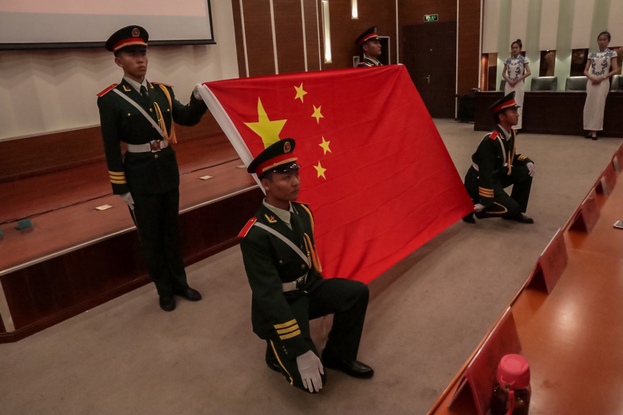 為慶祝中華人民共和國成立70周年,大會開始前,首先舉行迎國旗、唱國歌儀式。