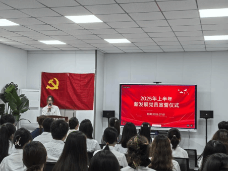2025年7月1日,“一站式”學生服務社區勤學坊內洋溢著莊嚴而熱烈的氛圍,2025年上半年新發展黨員入黨宣誓儀式在此隆重舉行。黨委副書記郭雅娟、黨委辦公室常務副主任張莉以及74名新發展黨員參加宣誓儀式。