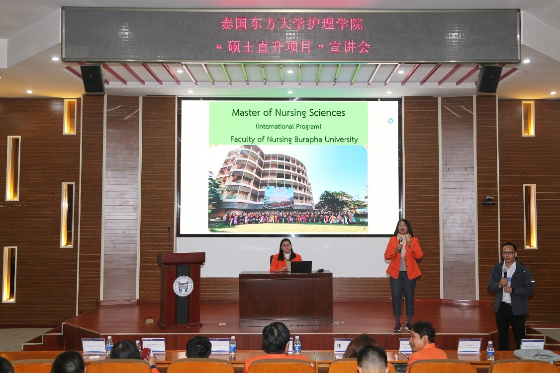 交流會后,泰國東方大學(BUU)面向大健康學院護理專業學生開展碩士項目宣講,東方大學碩士項目負責人Dr. Chintana Wacharain在會上分享了泰國東方大學(BUU)的概況以及碩士項目的課程設置、申請流程和優勢,詳細介紹了BUU的留學生政策、留學費用、實習實踐、畢業工簽等同學們比較關注的問題。同時,對于泰國東方大學短期研學項目進行了講解,熱情邀請同學們赴泰體驗學習。會后耐心幽默地解答了同學們的疑問,此次宣講產生熱烈反響。