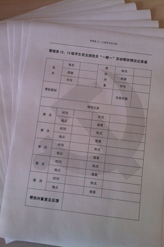 管理系11級(jí)學(xué)生第一黨支部、第二黨支部、12、13級(jí)學(xué)生黨支部目前共有學(xué)生黨員53名,在此次幫扶活動(dòng)中,要求每名學(xué)生黨員任選所在班級(jí)中一名有學(xué)習(xí)困難的學(xué)生,開(kāi)展幫扶活動(dòng),及時(shí)了解幫扶學(xué)生在學(xué)習(xí)中面臨的具體困難,針對(duì)學(xué)習(xí)狀態(tài)不好的學(xué)生要對(duì)其出勤、聽(tīng)課及課后作業(yè)完成情況進(jìn)行督促;針對(duì)專(zhuān)業(yè)課程學(xué)習(xí)過(guò)程中遇到的困難給予及時(shí)解決并認(rèn)真做好幫扶記錄。