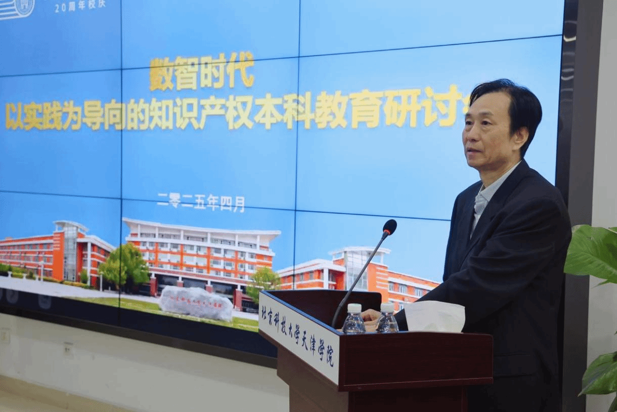 天津市知識產權局政策法規處四級調研員王瑞代表市知識產權局發表開幕致辭。她提到,今年是專利法實施40周年,天津市在知識產權工作上成果顯著。知識產權是創新發展的重要力量,北京科技大學天津學院在知識產權人才培養等領域成績突出。她強調,以實踐為導向的本科教育對培養高素質人才至關重要,希望研討會能推動知識產權教育創新。