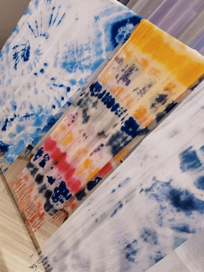通過親自動手,大家根據自己的喜好和創意,對提前準備好的絲巾進行“扎”與“染”等一系列操作,一扎一染,一浸一潤,一條潔白的絲巾染上斑斕的色彩,每一幅獨一無二的作品,展現了大家對美的理解和追求,蘊藏著勞動的智慧與創造力。