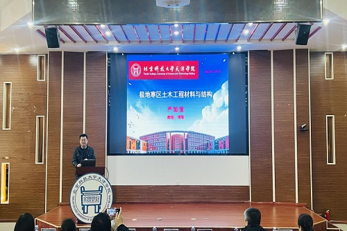 聘任儀式結束后,嚴加寶教授在理工館學術報告廳做了主題為“極地寒區土木工程材料與結構”的專題講座。報告以極寒地區重大工程建設需求為背景,介紹了土木工程材料和結構在極寒環境中的力學性能演化特征,獲得了一系列具有國際先進性的創新科研成果,為國家重要工程設施的建設提供了重要科學技術支撐。