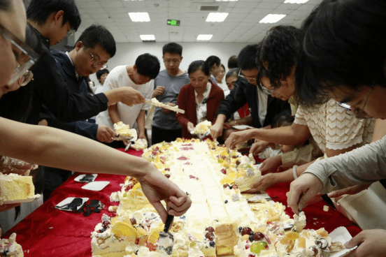 到場的老師們同唱生日快樂歌,吹蠟燭,蛋糕的香甜在空氣中彌漫,一塊塊分遞到大家手中,歡聲笑語也隨之此起彼伏。