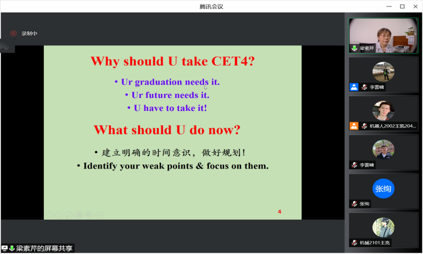 為加強學(xué)院學(xué)風(fēng)建設(shè),使同學(xué)們擺正學(xué)習(xí)心態(tài),全身心投入到英語四六級復(fù)習(xí)備考當(dāng)中,6月22日下午,智能制造學(xué)院分團委舉辦四六級動員培訓(xùn)會,邀請原北京科技大學(xué)文法學(xué)院副院長、天津市大學(xué)外語指導(dǎo)委員會委員、現(xiàn)任北京科技大學(xué)天津?qū)W院教學(xué)質(zhì)量監(jiān)控中心教學(xué)督導(dǎo)、外國語學(xué)院英語教學(xué)研究中心主任梁素芹教授做專題講座。智能制造學(xué)院院長陳寶江、黨總支書記陳月、大學(xué)英語教研室主任張絢、全體輔導(dǎo)員與全院學(xué)生參加,活動由分團委書記李雲(yún)嘯主持。