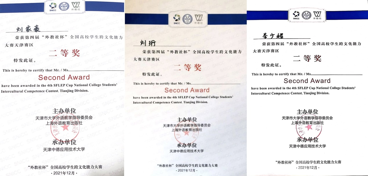 近日,在天津市外語教學指導委員會和上海外語教育出版社主辦的第四屆“外教社杯”全國高校學生跨文化能力大賽天津賽區(qū)比賽中,外國語學院三名同學取得佳績,英語專業(yè)劉家豪同學、劉珩同學和日語專業(yè)李少媚同學榮獲二等獎,指導老師為張媛、姜艷麗、孟彤。