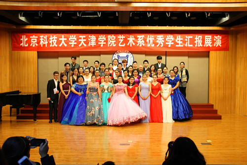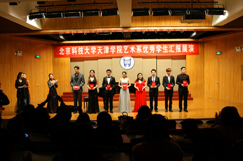 2015年11月11日18:30,北京科技大學(xué)天津?qū)W院藝術(shù)系優(yōu)秀學(xué)生匯報展演在12教學(xué)樓弘藝音樂廳舉行。 在藝術(shù)系聲樂1401班王明明同學(xué)和聲樂1302班魏欣同學(xué)的精彩開場白后,演出正式拉開了帷幕。