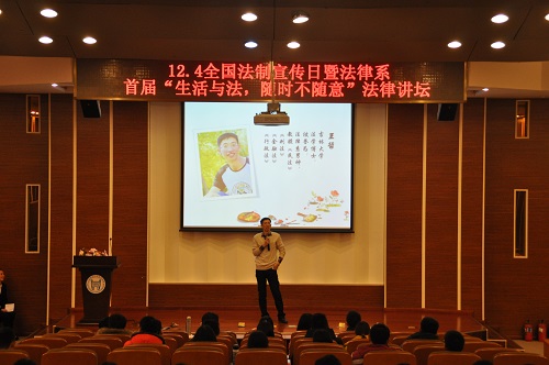 為弘揚憲法精神,加深同學們對法律知識的了解,體會法律的重要性,法律系分團委、學生會以“全國法制宣傳日”為契機,于12月4日下午15:30在理工館學術報告廳舉辦的首屆“生活與法,隨時不隨意”法律講壇。