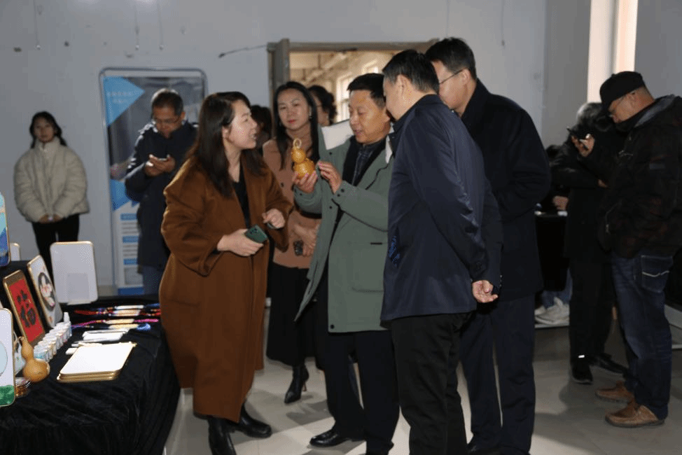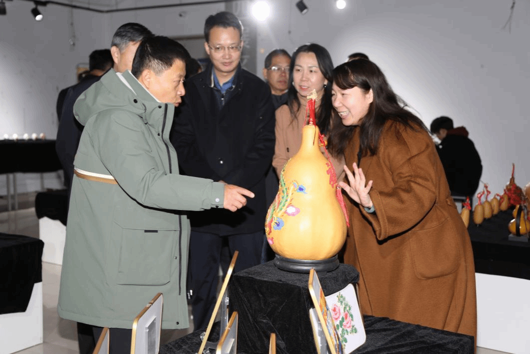 與會領導跟隨李文紅主任的講解,共同參觀了非遺傳承工作室教學成果展,對學生在金石撕紙、掐絲彩砂畫、葫蘆烙畫、彩蛋制作、剪紙等非遺傳承教學中的成果表示高度贊揚。