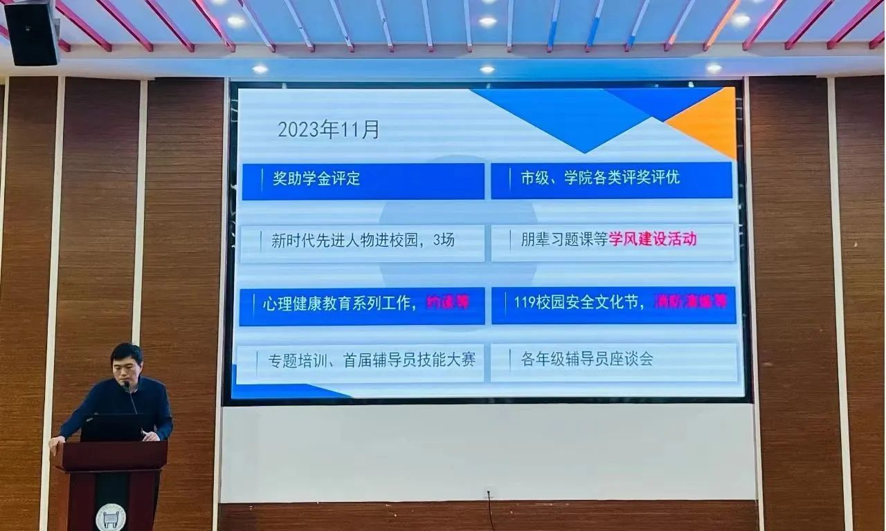 為學(xué)習(xí)宣傳貫徹習(xí)近平新時(shí)代中國特色社會主義思想和黨的二十大精神,加強(qiáng)我校學(xué)生工作干部隊(duì)伍專業(yè)化建設(shè),提升履職盡責(zé)的理論水平、專業(yè)素質(zhì)和綜合能力,學(xué)院于10月31日至11月2日舉行2023年秋季學(xué)生工作干部集中培訓(xùn)。北京科技大學(xué)學(xué)生工作部副部長劉震、副部長高龑、河北工業(yè)大學(xué)學(xué)生工作部副部長(2022年河北省輔導(dǎo)員年度人物)高雪冬、天津師范大學(xué)學(xué)生工作部思政科科長曹陶科等專家分別作輔導(dǎo)報(bào)告。學(xué)生工作相關(guān)單位全體成員,各院系黨總支書記及全體輔導(dǎo)員共94人參加此次培訓(xùn)。