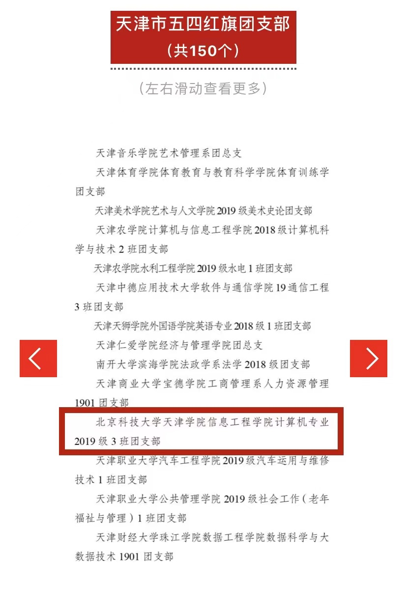近日,天津“兩紅兩優”光榮榜揭曉,旨在表彰先進,引導各級團組織和廣大團員、團干部學習先進、奮發有為。金沙城js93線路檢測中心管理學院分團委榮獲“天津市五四紅旗團委”稱號,信息工程學院計算機1903班團支部榮獲“天津市五四紅旗團支部”稱號,藝術學院視傳1901班王詩宇、大健康學院護理1901班王蓉榮獲“天津市優秀共青團員”稱號。